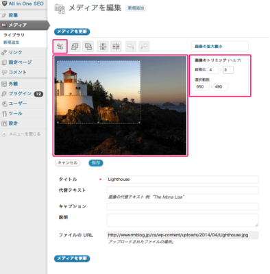 メディアのライブラリの一覧から画像を選択して編集画面に移動します。