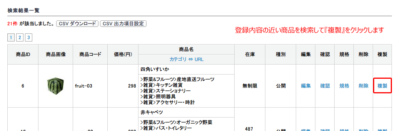 登録情報の近い商品を『複製』して修正することで効率的に商品を追加していただけます。 商品管理>商品マスター にて、登録情報の近い商品を検索して『複製』をクリックします。