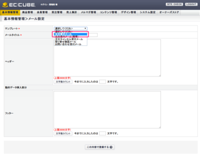 EC-CUBE管理画面>基本情報管理>メール設定より、注文メールの文章の変更が行えます。