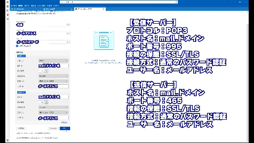 3 (mail.ドメイン)受信サーバーは【 995 】 送信サーバーは【 465 】