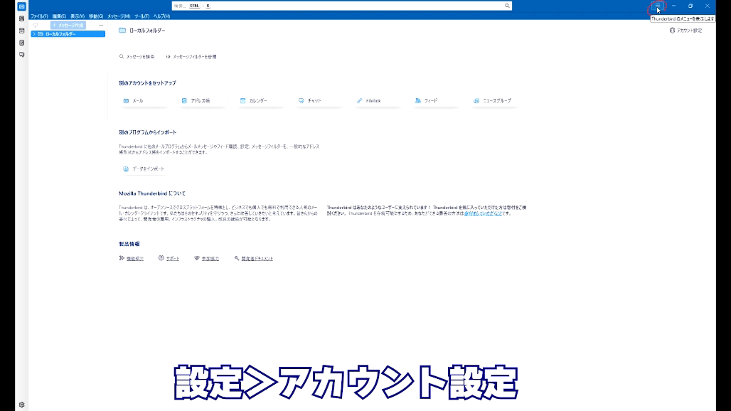 ①サンダーバードのソフトを起動し、右上にある『アカウント設定』をクリック