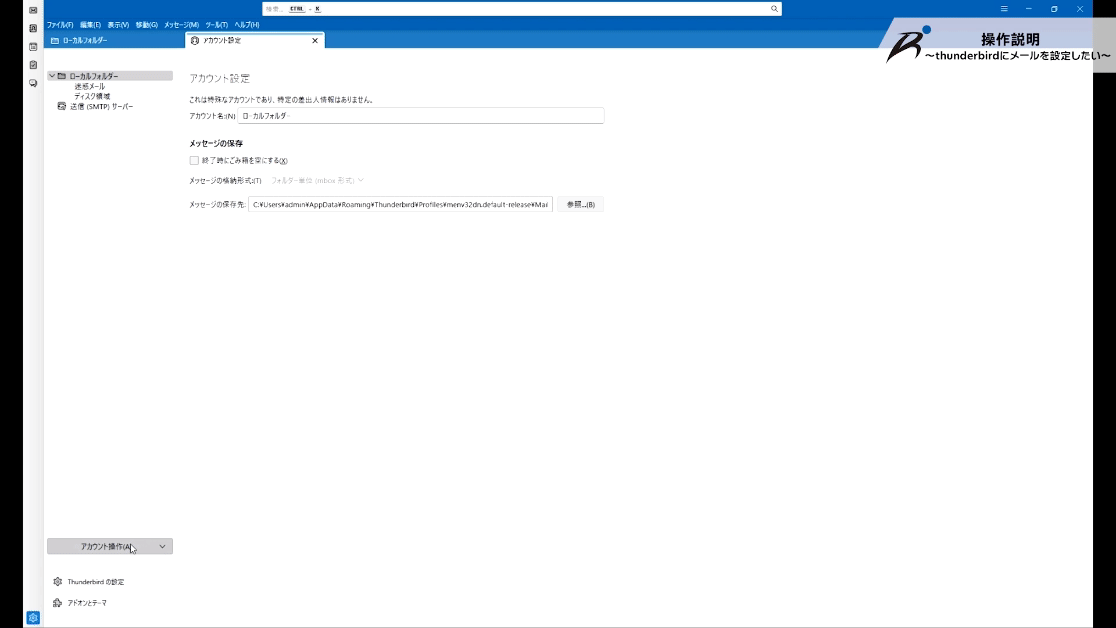 ②左下にある アカウント操作 > メールアカウントを追加 をクリック