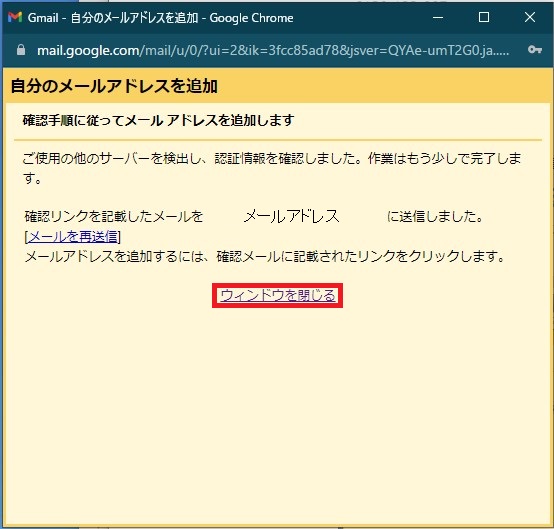 ⑪メールアカウントが追加されました。ウインドウを閉じる をクリックし、受信トレイを確認してください。