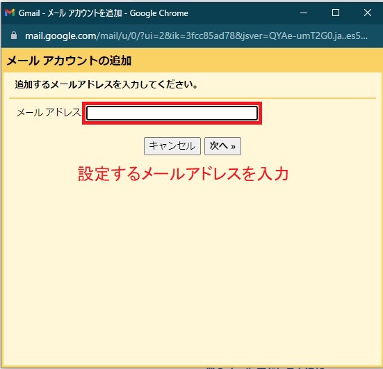 ⑤下図の画面が表示されます。設定するメールアドレスを入力してください。