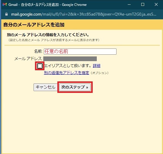 エイリアスとして扱います。 のチェックは外してください。