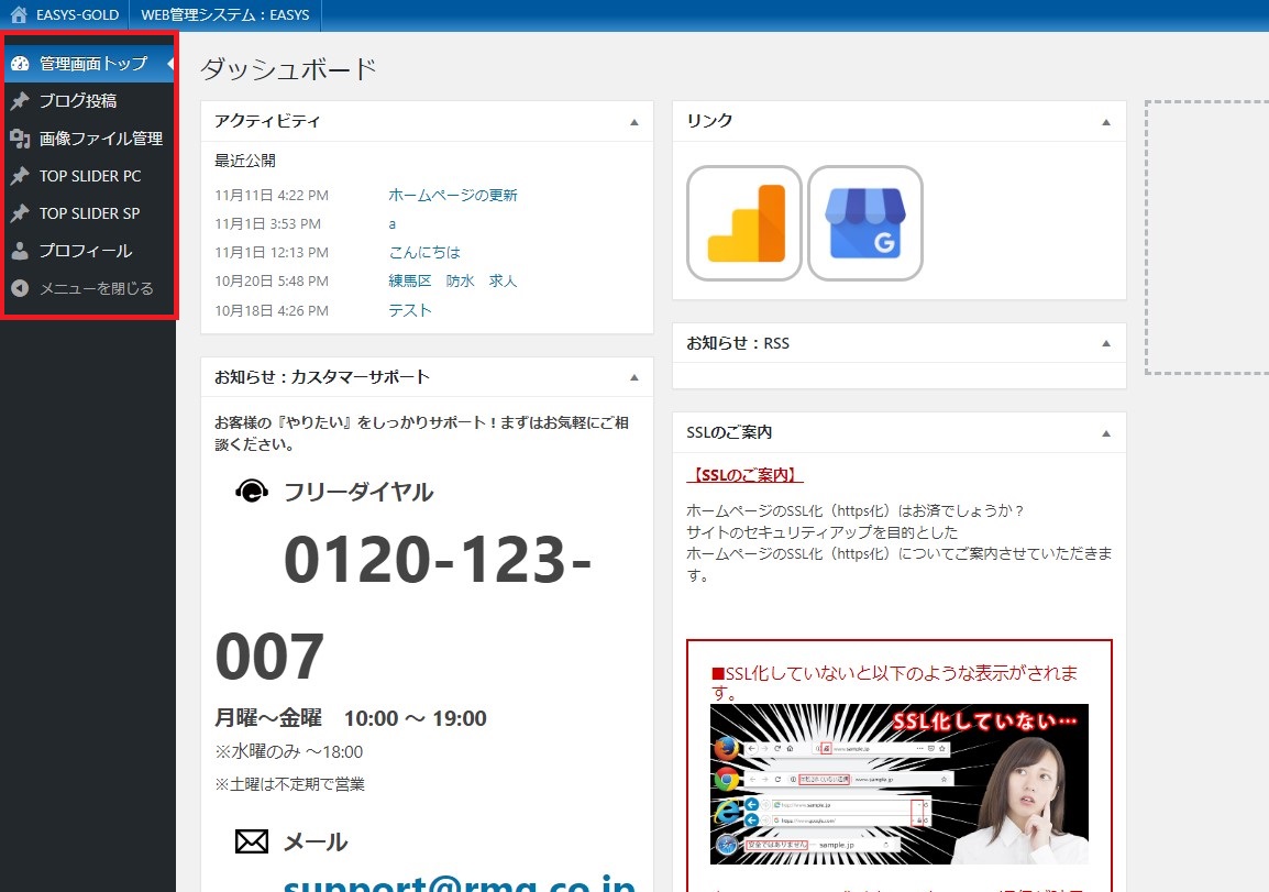 管理画面にアクセスした際、ログイン画面が表示されなかったり、『403 Forbidden』や『502サーバー接続エラー』などのエラーメッセージが表示された際は、弊社サポートまでご連絡ください。